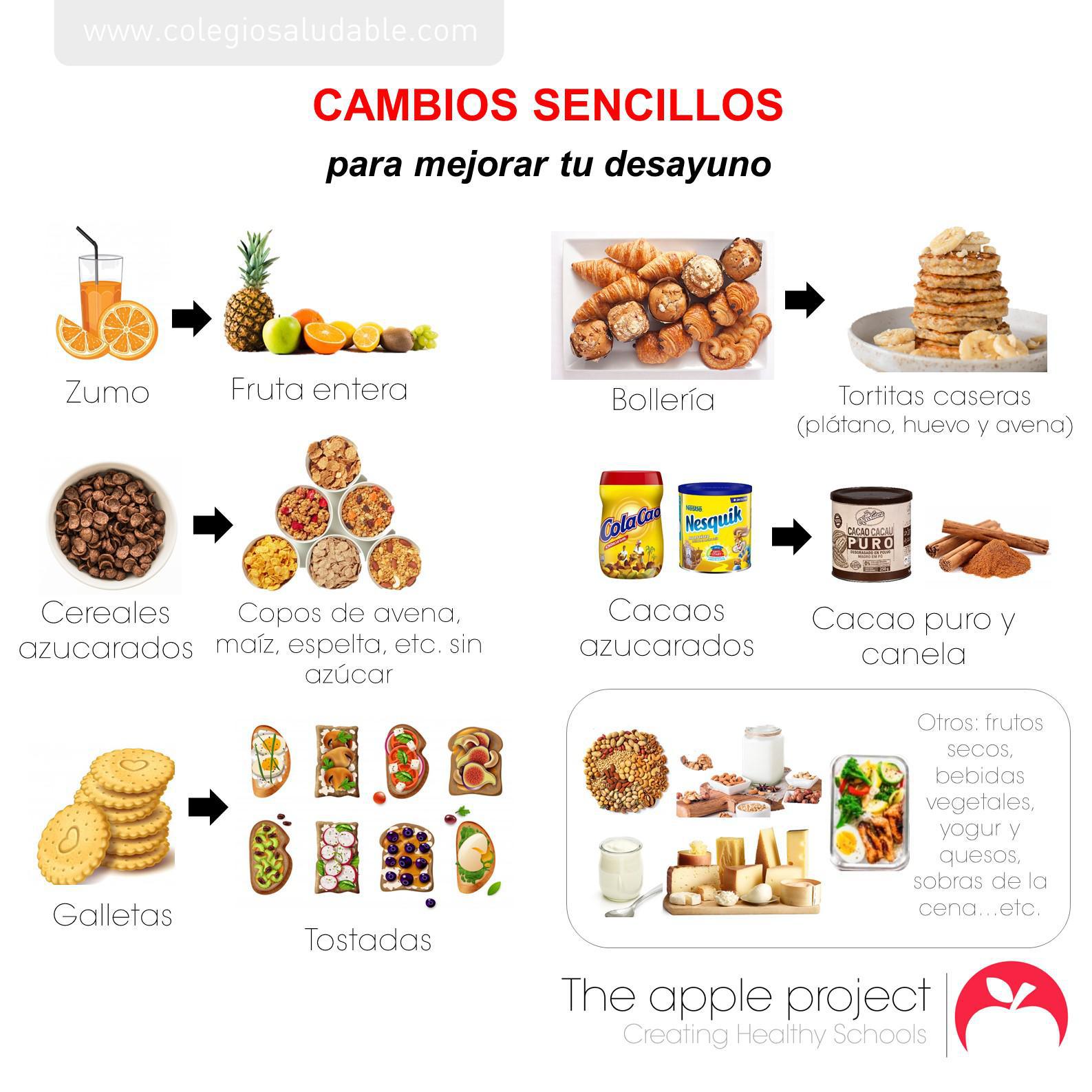 Para un buen desayuno, como alternativa saludable a los cereales azucarados, galletas etc., (que por cierto, son de los alimentos más ultraprocesados que existen) puedes optar por: lácteos enteros o semidesnatados naturales sin azucarar (leche, yogur natural, queso fresco…), cereales (integrales y sin azúcares añadidos), pan integral, fruta o verdura (pieza entera o tomate, por ejemplo), huevos (tortilla, revueltos…), gazpacho o salmorejo, o cualquier otro alimento que te imagines.
